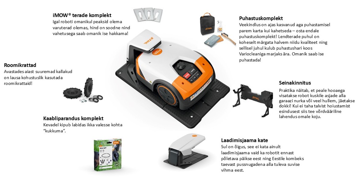 Vähem tähtis pole ka lisavarustuse valik ja hoolduse lihtsus! Kõik robotniiduki tehnilised sõlmed on lihtsasti hooldatavad ja kuluosad vahetatavad. Sedasi võid kindel olla, et tehnilise rikke korral vahetad vaid vajalikud osad, mitte pool niidukit!