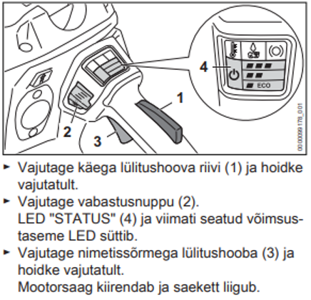 Liigume kaitsevarustusest edasi masinate juurde. Kui ohutuks on tehtud tänapäeval saed? Kas akusaed on ohutumad? Akusaagide maailm areneb kiiresti ja need on sama võimsad, kui bensiinimootorsaed. Akusaag juba oma nimepoolest tundub lihtne ja väike tööriist, mis vähendab konkreetset ohutunnet. Paljud ütlevad, et “ah see mänguasi ei tee midagi…” Tegelikult on akusaag sama ohtlik tööriist, kui tavaline saag. Suurim vahe on müratasemes. Akusaag ei vaja otseselt kõrvaklappe, aga siiski on see soovitatav. Metsatööde jaoks väiksemale isetegijale sobib akusaag väga hästi- see on mugavam, lihtsam käsitleda (pole seguõli, kütust, filtreid), kergem ja väikse hooldusvajadusega. Hoolduse juurde käib tööriista igapäevane puhastamine. See on vajalik ka akusael. Iga õige peremees hoiab oma tööriistad puhtad ja korras. Akusaagide kõige suurem risk on see, et need ei tee häält, kui on nn. aktiveeritud ooterežiimis, ehk päästiku vajutamisega hakkab kohe mootor tööle. Selle vältimiseks on näiteks STIHLil vaja alati vähemalt kahe nupu vajutust (üldiselt pöidla all), mis on tegelikult äärmiselt lihtne ja mugav, aga välistab kogemata käivitamise. Näide pildil STIHL MSA 300 käivitamisest, kus pildil lülitid 1 ja 3 on sama asetusega nagu bensiinimootorsael, aga et kett ringi hakkaks käima, tuleb korraks vajutada ka lülitit 2.